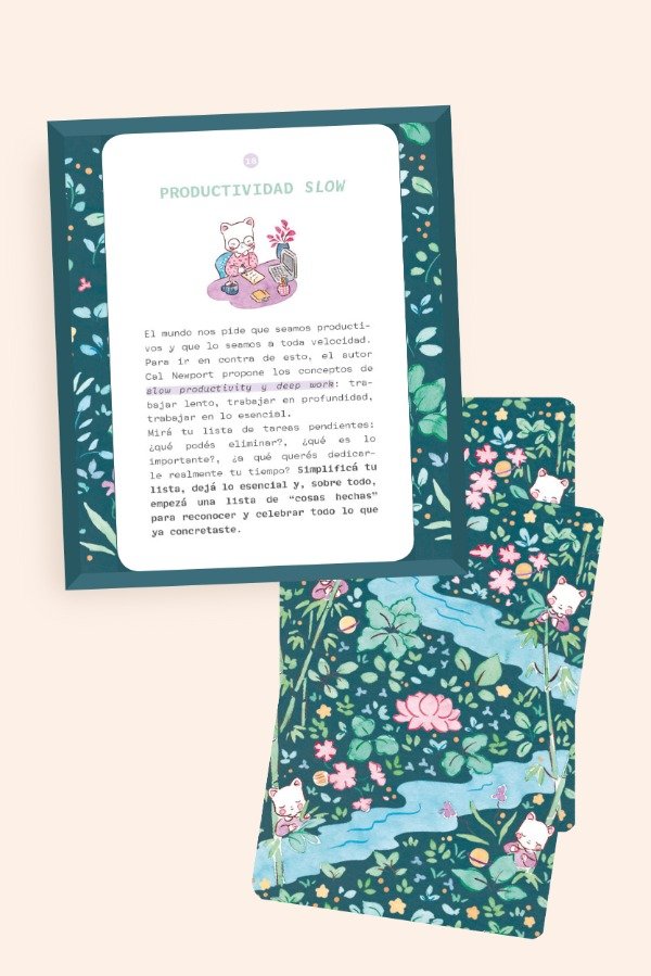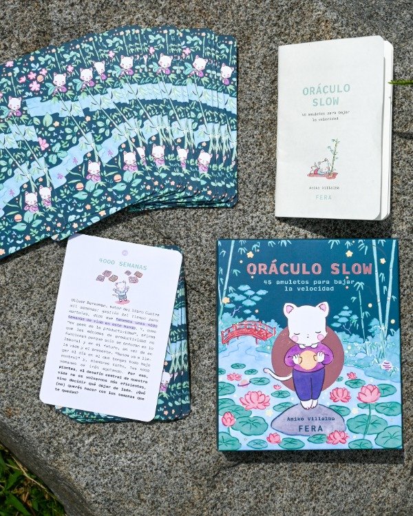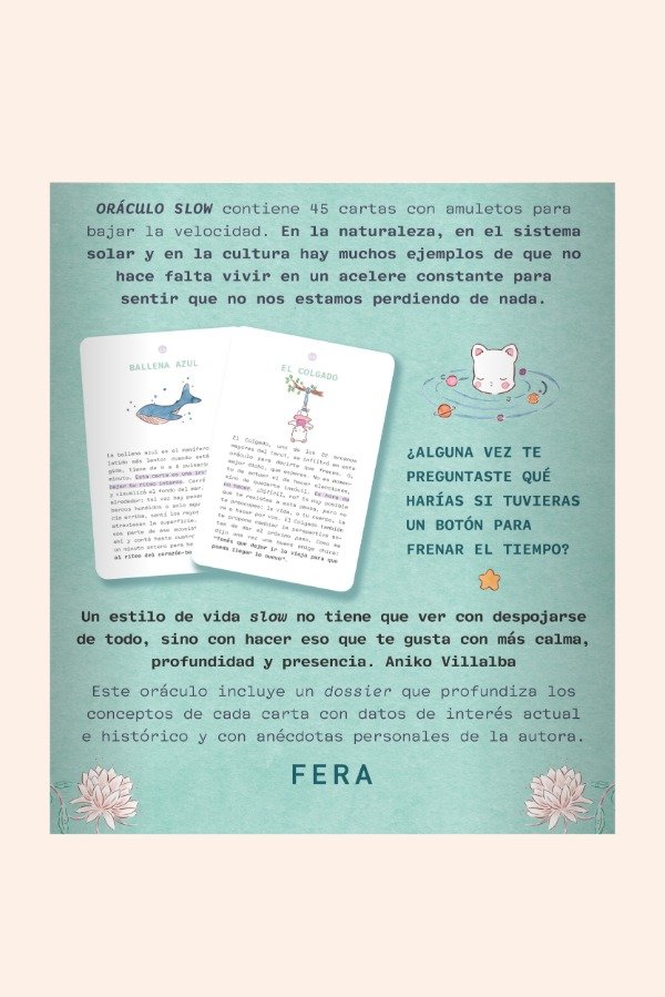 Este oráculo contiene 45 cartas con amuletos para bajar la velocidad. En la naturaleza, en el sistema solar y en la cultura hay muchos ejemplos de que no hace falta vivir en un acelere constante para sentir que no nos estamos perdiendo nada.