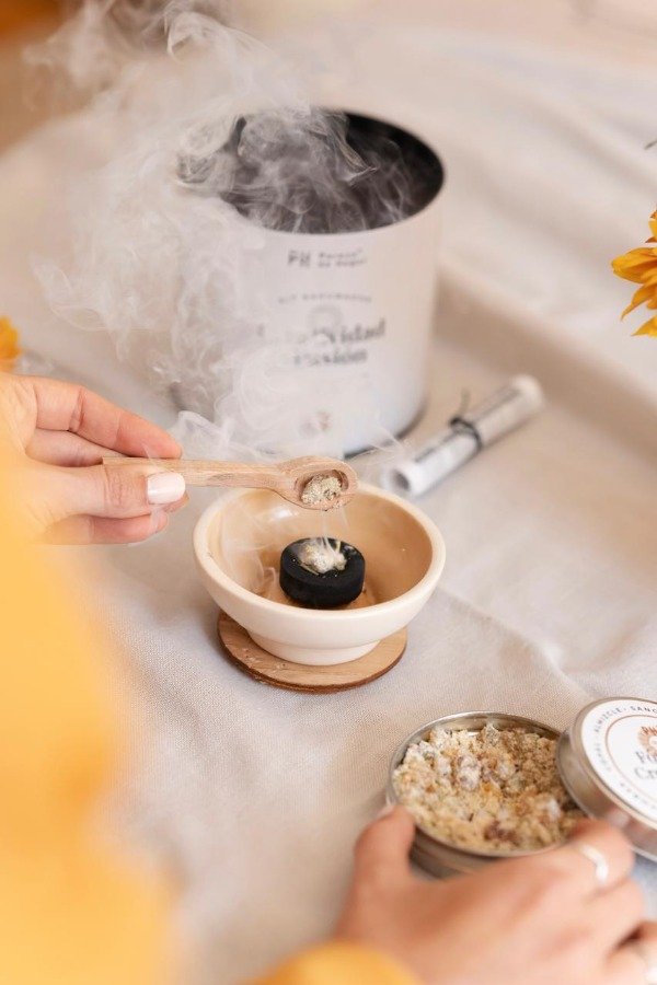 La aromaterapia en este ritual no solo sirve para ambientar el espacio, sino que actúa como un puente entre lo físico y lo espiritual, facilitando la conexión con una realidad más verdadera y alineada con el don de la creatividad.